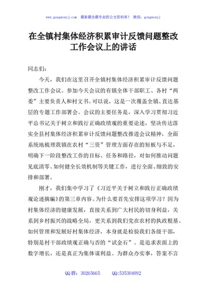 / 在全镇村集体经济积累审计反馈问题整改工作会议上的讲话