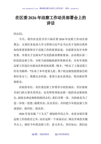 / 在区委2026年巡察工作动员部署会上的讲话