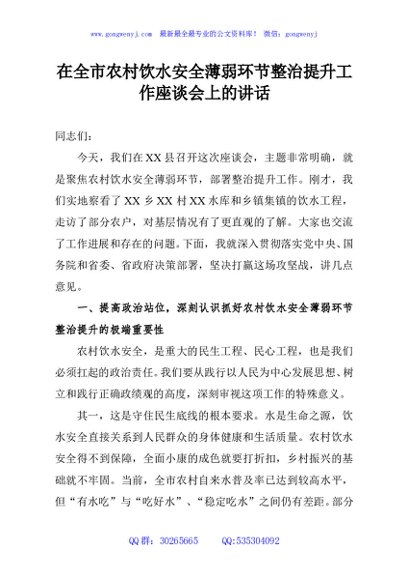/ 在全市农村饮水安全薄弱环节整治提升工作座谈会上的讲话