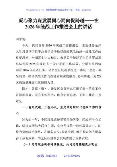 / 凝心聚力谋发展同心同向促跨越——在2026年统战工作推进会上的讲话