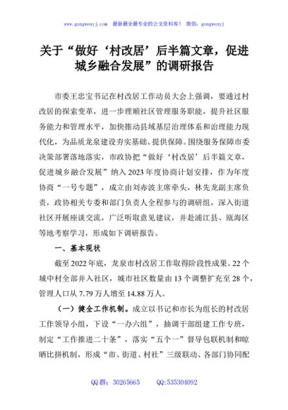 / 关于“做好‘村改居’后半篇文章,促进城乡融合发展”的调研报告