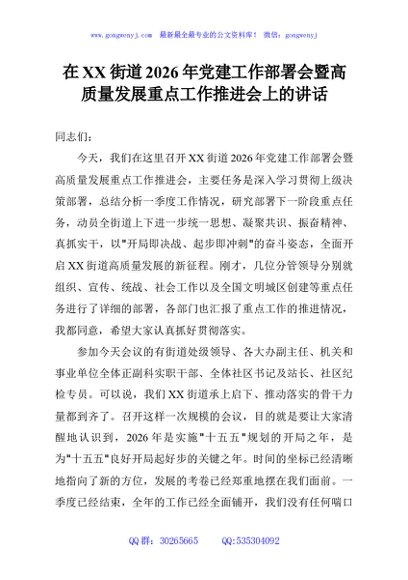 / 在XX街道2026年党建工作部署会暨高质量发展重点工作推进会上的讲话
