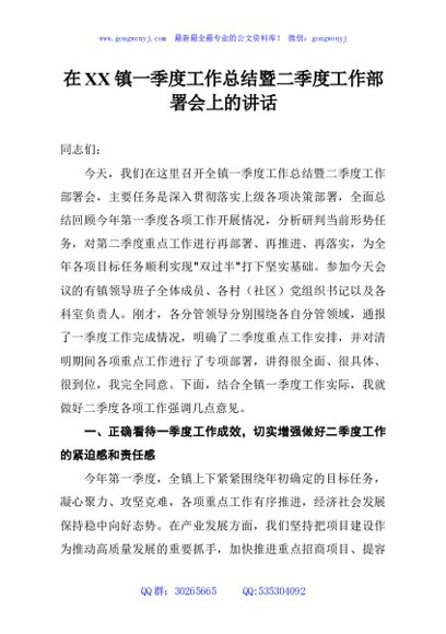 / 在XX镇一季度工作总结暨二季度工作部署会上的讲话