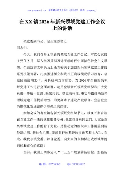 / 在XX镇2026年新兴领域党建工作会议上的讲话