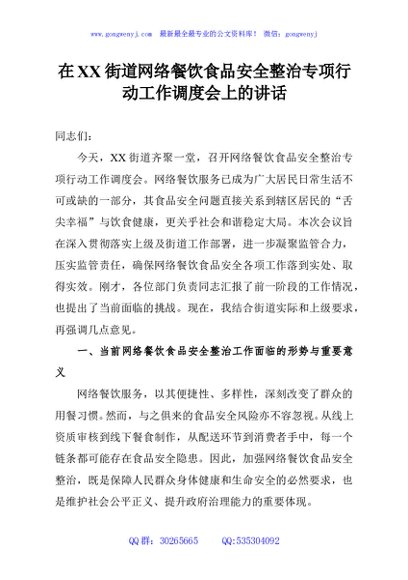 / 在XX街道网络餐饮食品安全整治专项行动工作调度会上的讲话