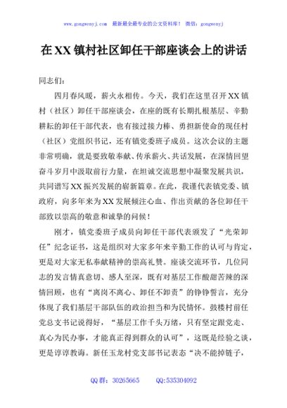 / 在XX镇村社区卸任干部座谈会上的讲话