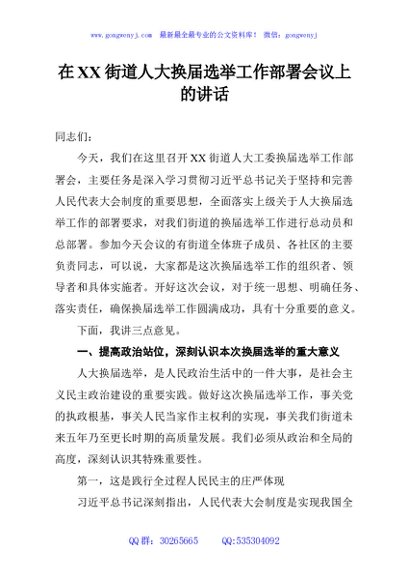 / 在XX街道人大换届选举工作部署会议上的讲话