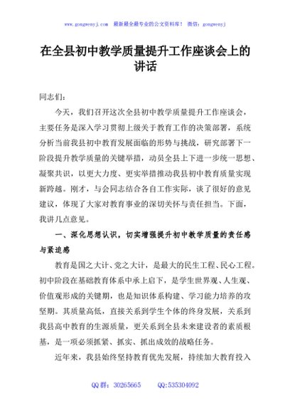 / 在全县初中教学质量提升工作座谈会上的讲话