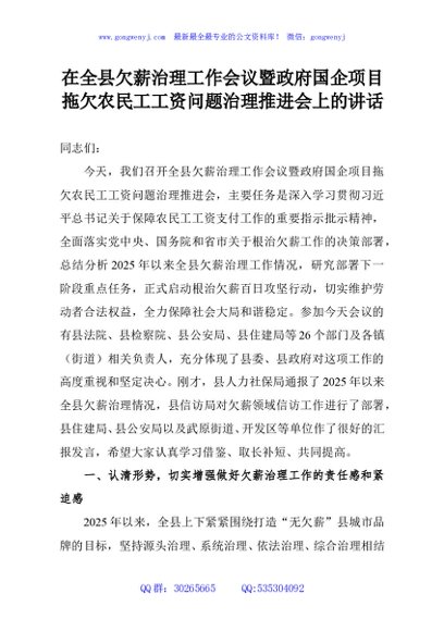 / 在全县欠薪治理工作会议暨政府国企项目拖欠农民工工资问题治理推进会上的讲话