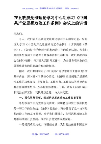 / 在县政府党组理论学习中心组学习《中国共产党思想政治工作条例》会议上的讲话