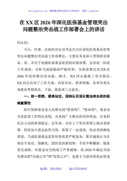 / 在XX区2026年深化医保基金管理突出问题整治突击战工作部署会上的讲话