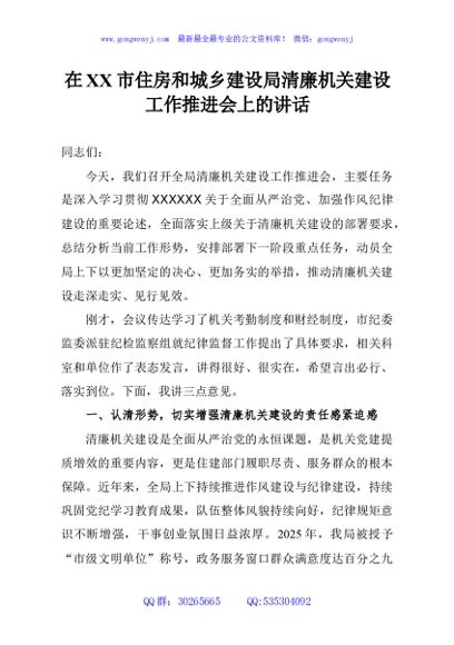/ 在市住房和城乡建设局清廉机关建设工作推进会上的讲话