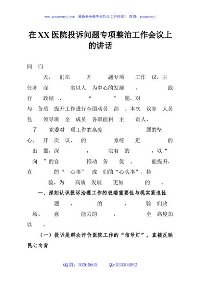 / 在XX医院投诉问题专项整治工作会议上的讲话