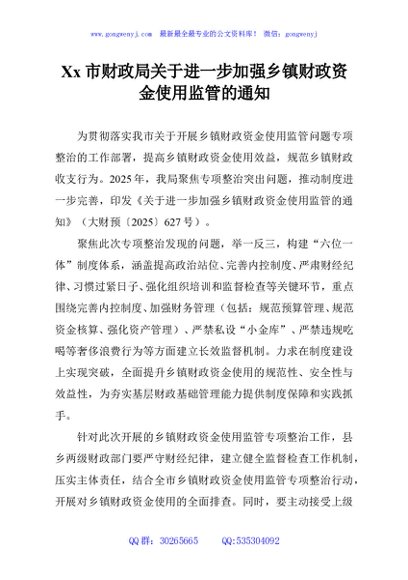 / Xx市财政局关于进一步加强乡镇财政资金使用监管的通知