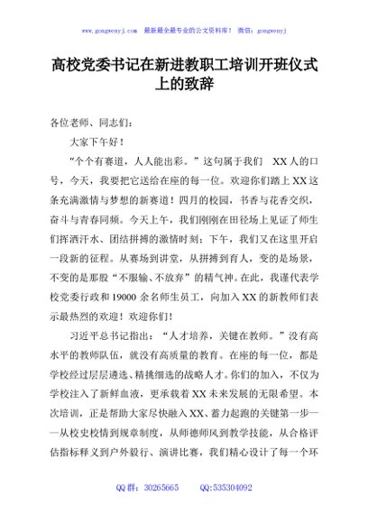 / 高校党委书记在新进教职工培训开班仪式上的致辞