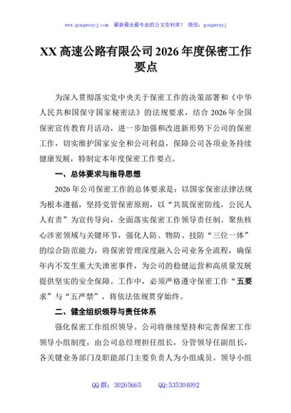 / XX高速公路有限公司2026年度保密工作要点