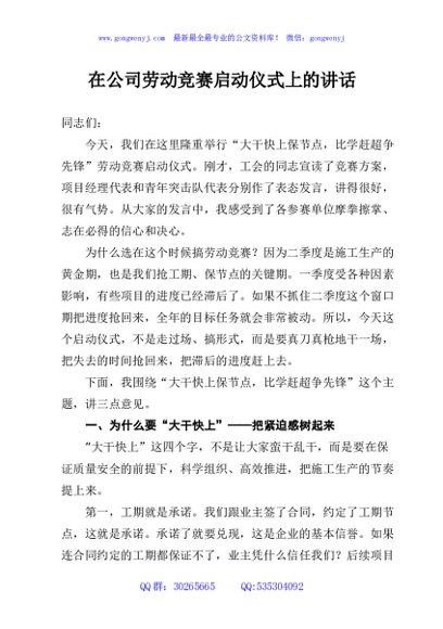 / 在公司劳动竞赛启动仪式上的讲话