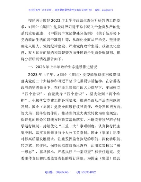 / 国企公司2023年上半年政治生态分析研判报告2900字