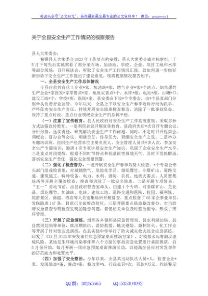 / 关于全县安全生产工作情况的视察报告