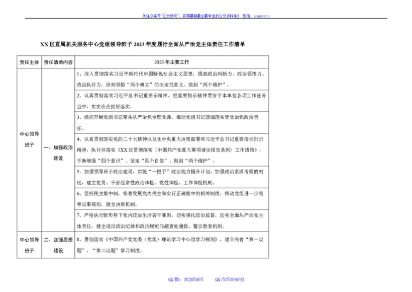 / 区直属机关服务中心党组领导班子2023年度履行全面从严治党主体责任工作清单