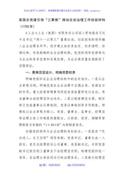 / 某国企党建引领“三聚焦”推动企业治理工作经验材料