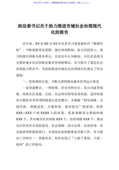/ 政法委书记关于助力推进市域社会治理现代化的报告