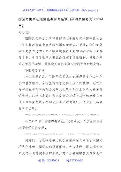 / 国企党委中心组主题教育专题学习研讨会主持词