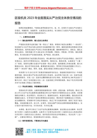 / 区级机关2023年全面落实从严治党主体责任情况的报告