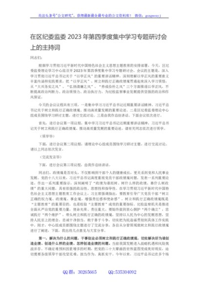 / 在区纪委监委2023年第四季度集中学习专题研讨会上的主持词