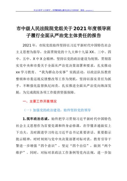 / 市中级人民法院院党组关于2021年度领导班子履行全面从严治党主体责任的报告