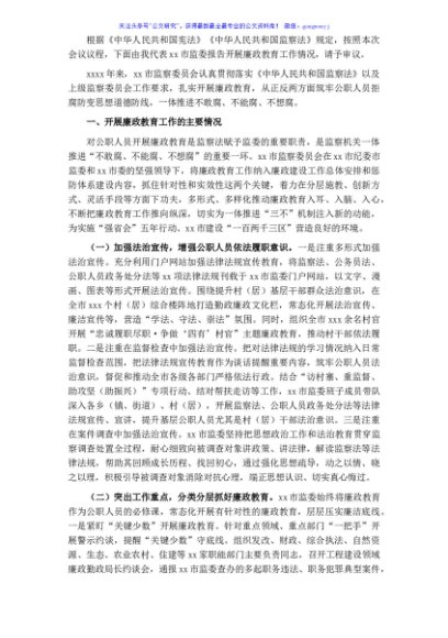 / 监察委员会关于开展廉政教育工作情况的报告(市级)