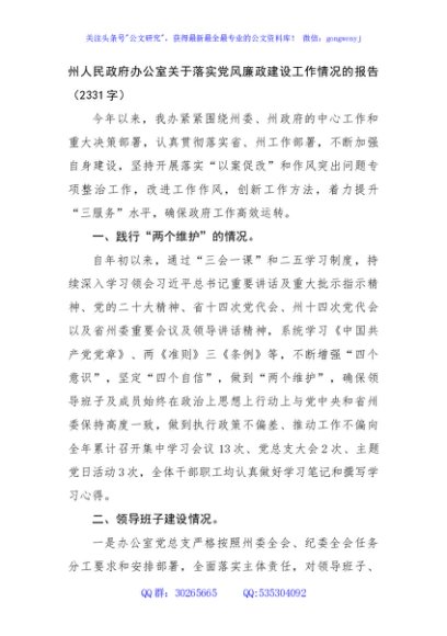 / 州人民政府办公室关于落实党风廉政建设工作情况的报告
