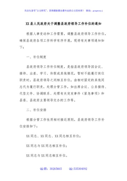/ XX县人民政府关于调整县政府领导工作补位的通知