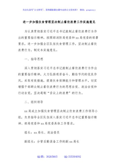 / 进一步加强伙食管理坚决制止餐饮浪费工作实施意见