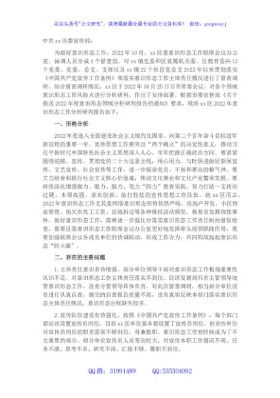 / 区委关于2022年意识形态工作分析研判的报告