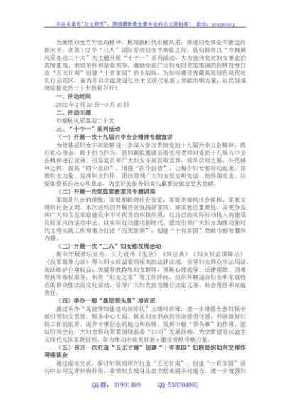 / 县妇联2022年“三八”国际劳动妇女节“十个一”系列活动方案