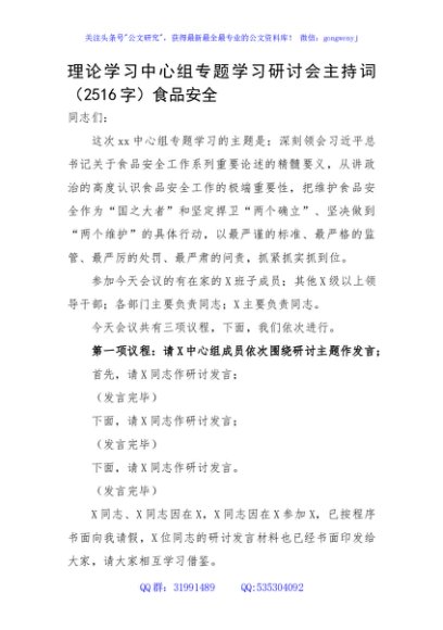 理论学习中心组专题学习研讨会主持词(食品安全
