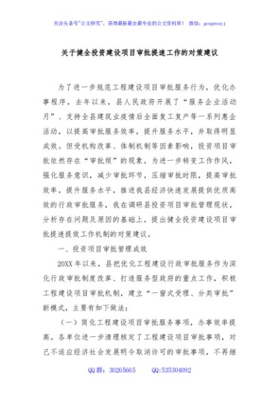/ 关于健全投资建设项目审批提速工作的对策建议