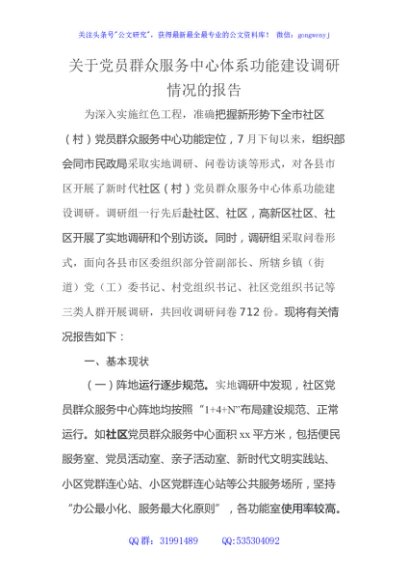 / 党员群众服务中心体系功能建设调研情况的报告