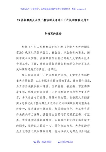 / XX县监察委员会关于整治群众身边不正之风和腐败问题工作情况的报告