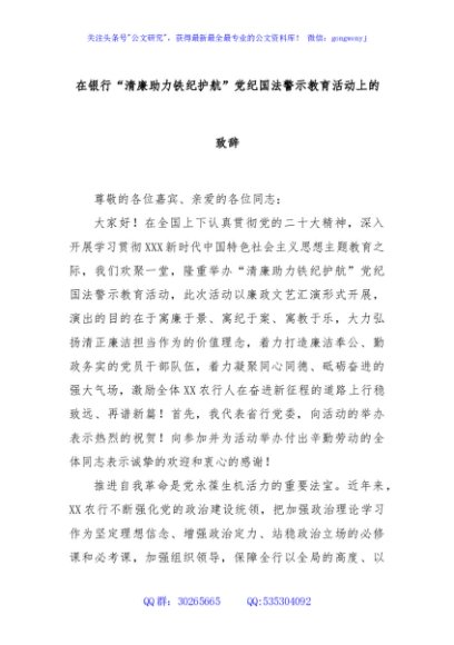 / 在银行“清廉助力铁纪护航”党纪国法警示教育活动上的致辞