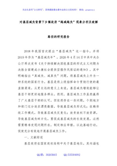 / 对基层减负背景下乡镇政府“越减越负”现象分析及破解路径的研究报告