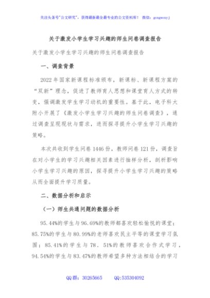 / 关于激发小学生学习兴趣的师生问卷调查报告