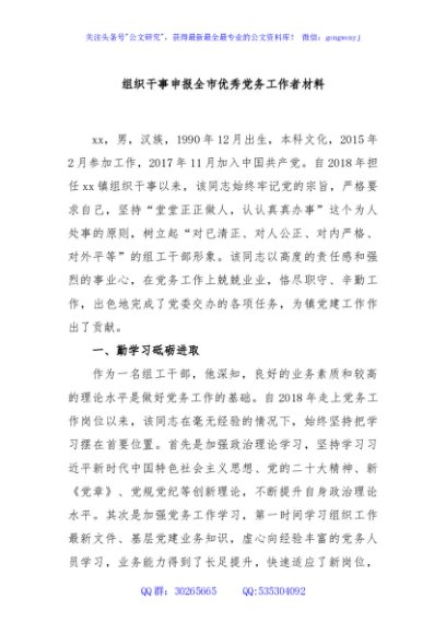 组织干事申报全市优秀党务工作者材料