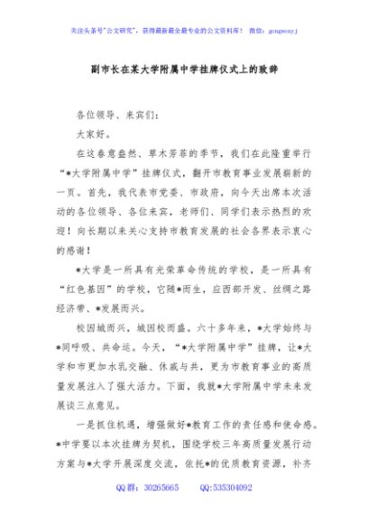 / 副市长在某大学附属中学挂牌仪式上的致辞
