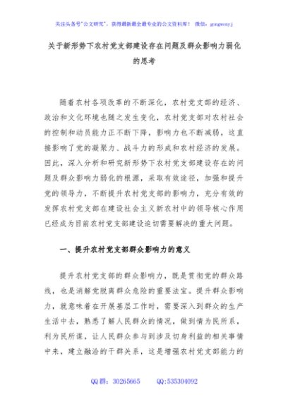 / 关于新形势下农村党支部建设存在问题及群众影响力弱化的思考