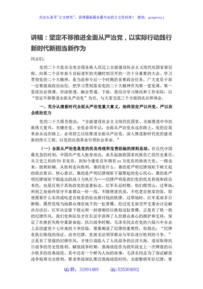 / 讲稿:坚定不移推进全面从严治党,以实际行动践行新时代新担当新作为