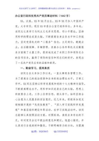 / 办公室行政科优秀共产党员事迹材料(1662字)