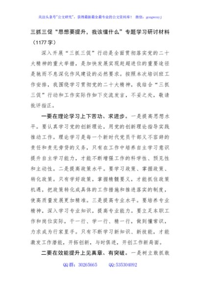/ 三抓三促“思想要提升,我该懂什么”专题学习研讨材料(1177字)