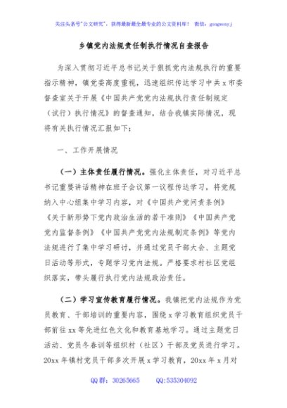 乡镇党内法规责任制执行情况自查报告